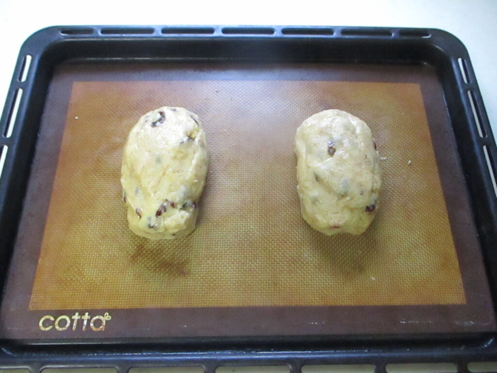 2,ドライフルーツとお好みのスパイスを加えて混ぜ合わせ、生地を2等分にする。