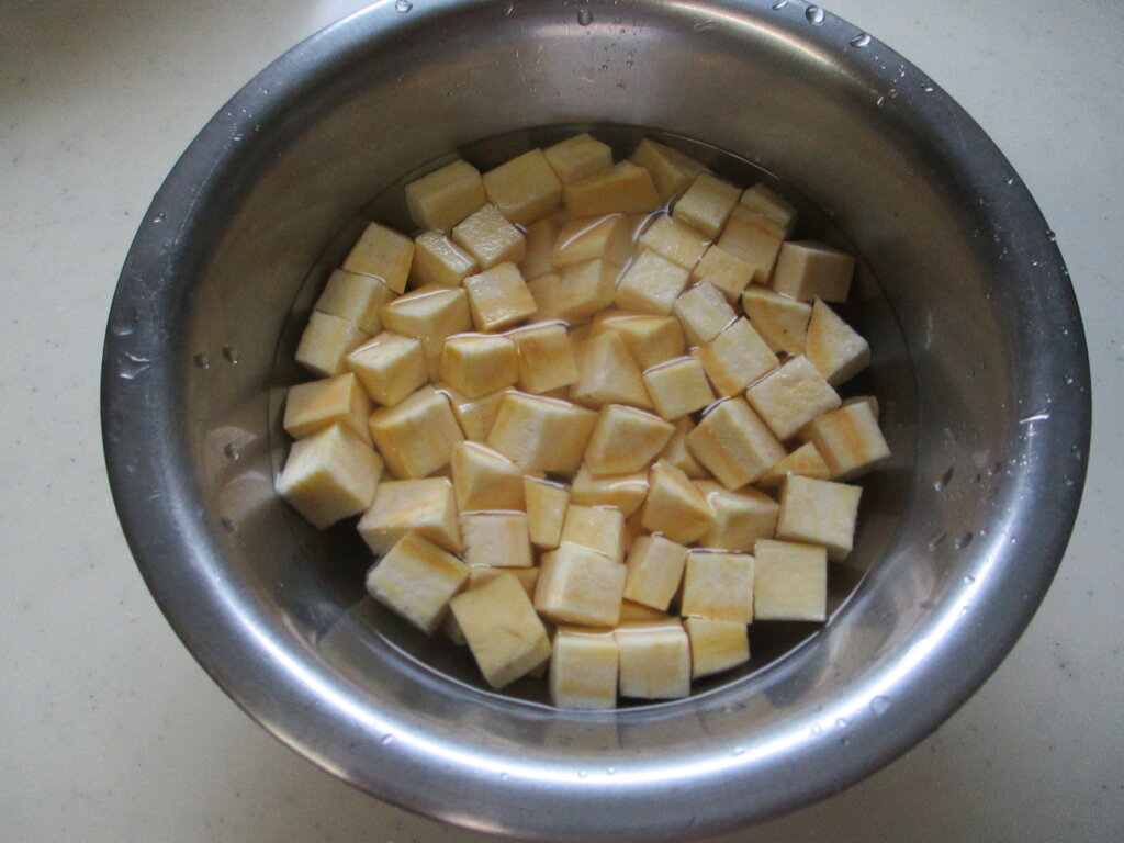 1,さつま芋は皮を剥き、7~10㎜程度の角切りにして少し水に浸してアク抜きしたら、水気をきって塩を軽くまぶしておく。