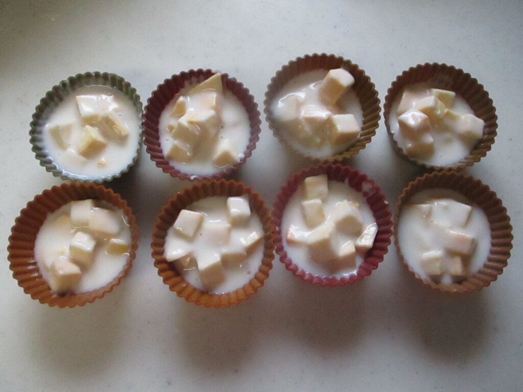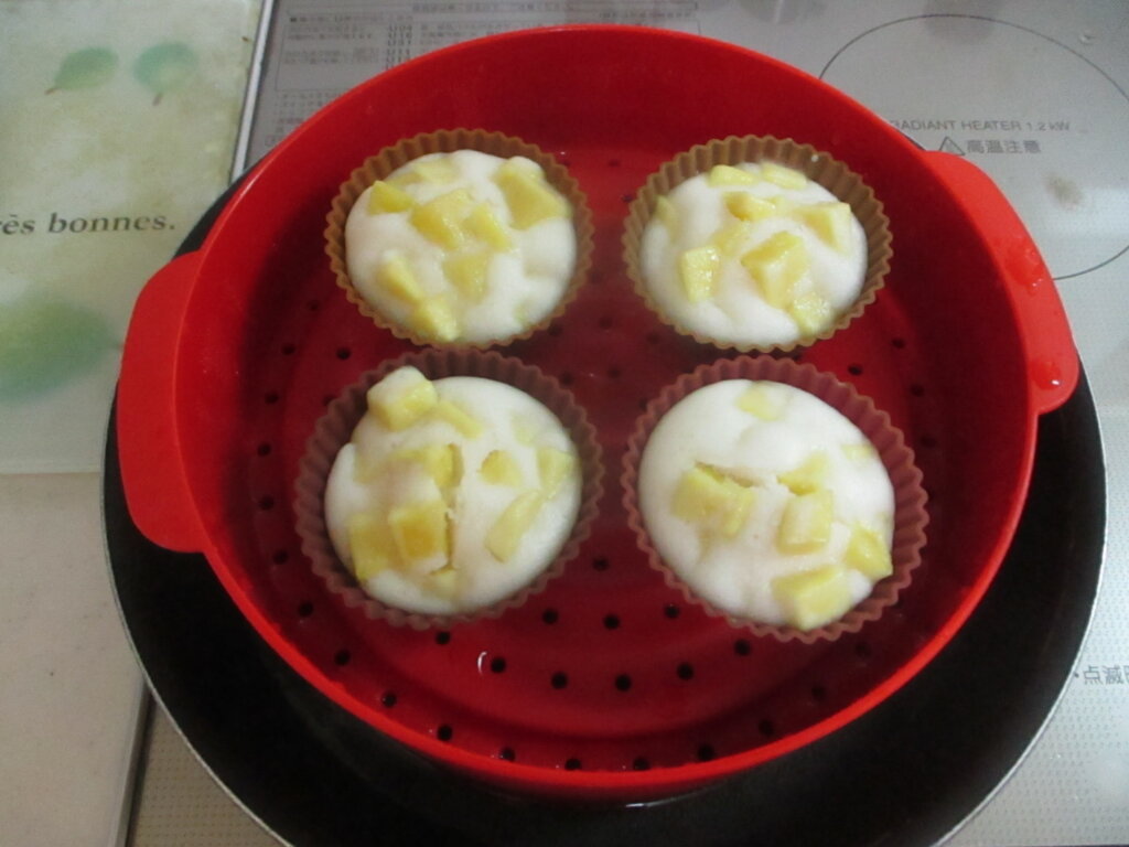 3,さつま芋を加えて生地と合わせたらカップに入れ、強火で20分蒸す。